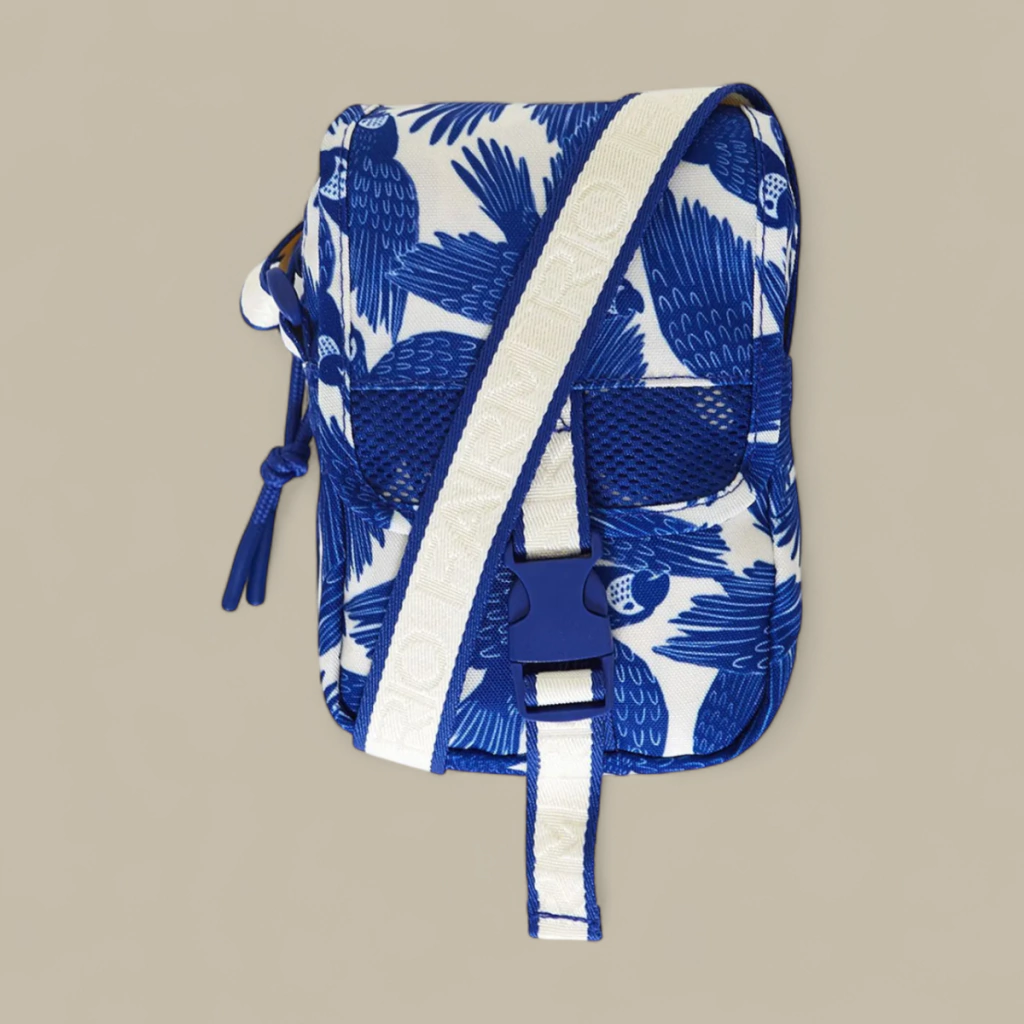 A bolsa tiracolo FARM RIO com estampa de araras é uma peça que traduz a essência da marca: natureza brasileira, arte e praticidade em perfeita harmonia. Com um visual monocromático sofisticado em azul e branco, esta bolsa combina com looks leves e tropicais, sendo uma escolha elegante e versátil para o dia a dia.