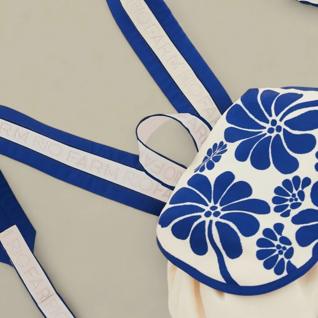 - Estampa exclusiva "Palermo Azul e Branca" FARM Rio: Um mix harmonioso de padrões florais, poás e detalhes orgânicos em tons de azul profundo e branco, evocando um estilo mediterrâneo e autêntico.