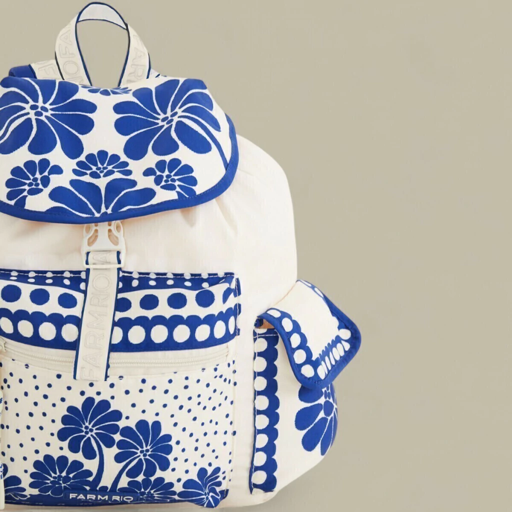 - Bolso frontal com zíper: Ideal para guardar itens menores e de acesso rápido, mantendo-os organizados e seguros. O puxador com a logomarca "FARM RIO" adiciona um toque extra de estilo.