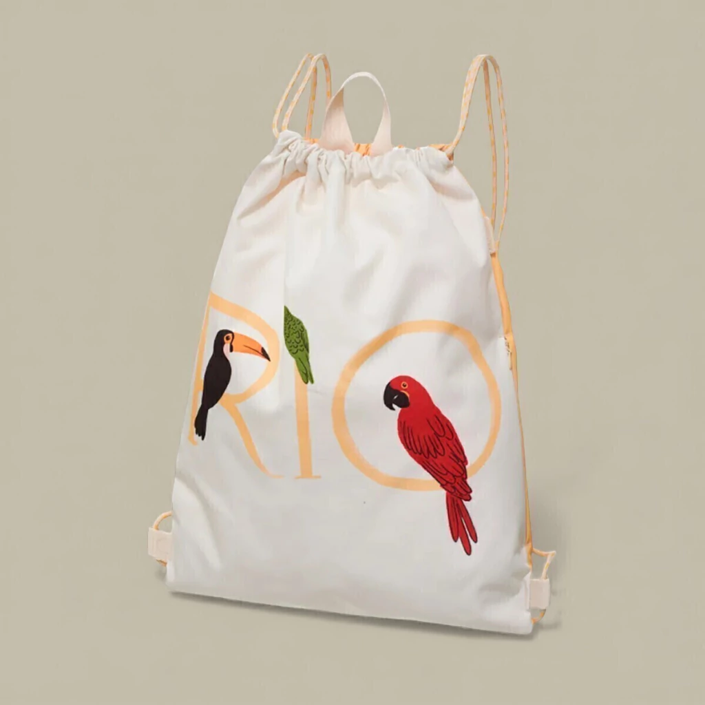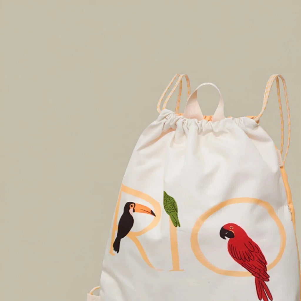 Estampa “Rio Off White” exclusiva da marca, que traz um fundo off-white neutro com design tropical ou urbano (“Rio”), conferindo versatilidade para praia ou cidade