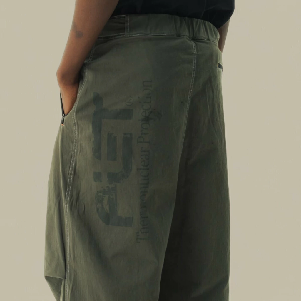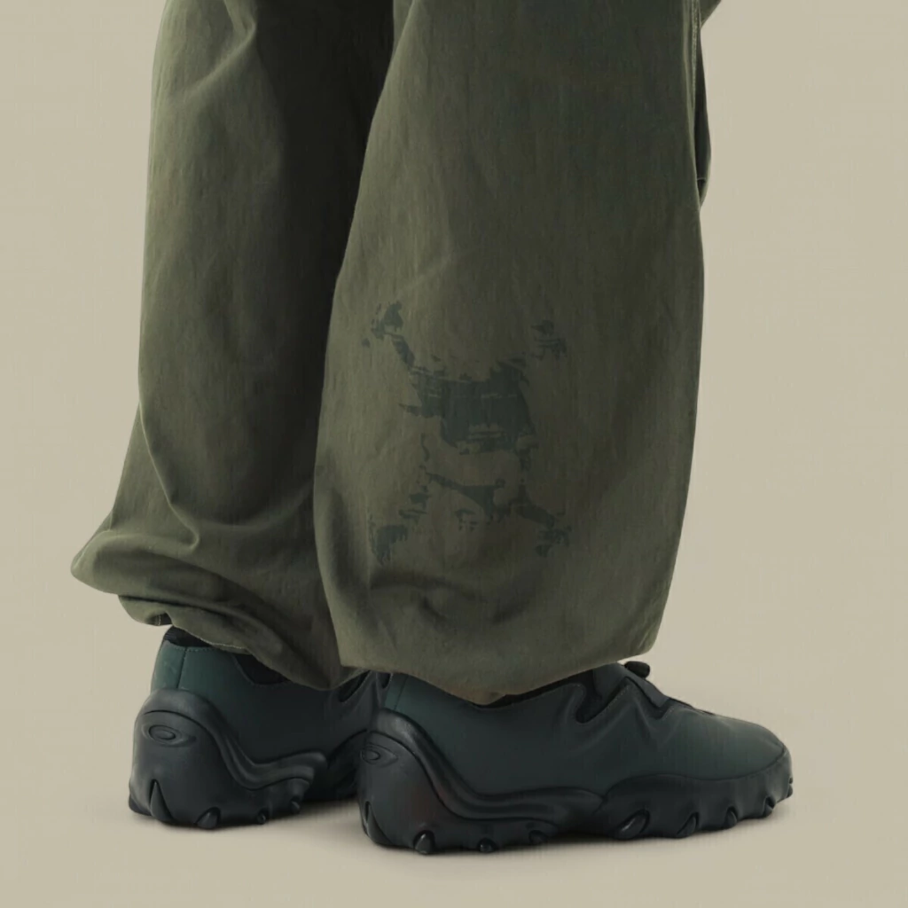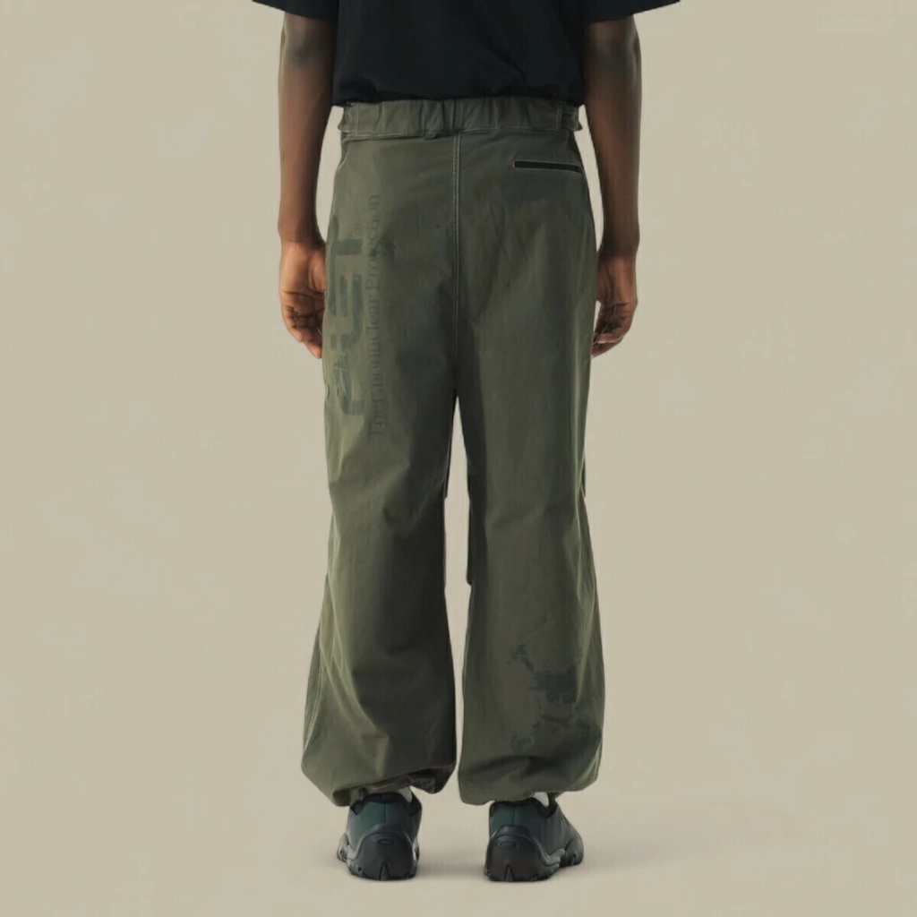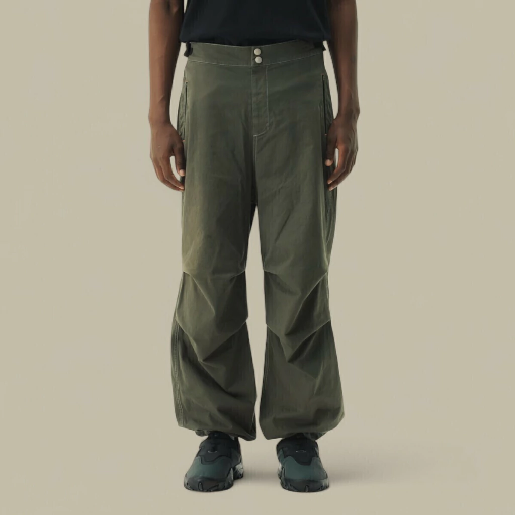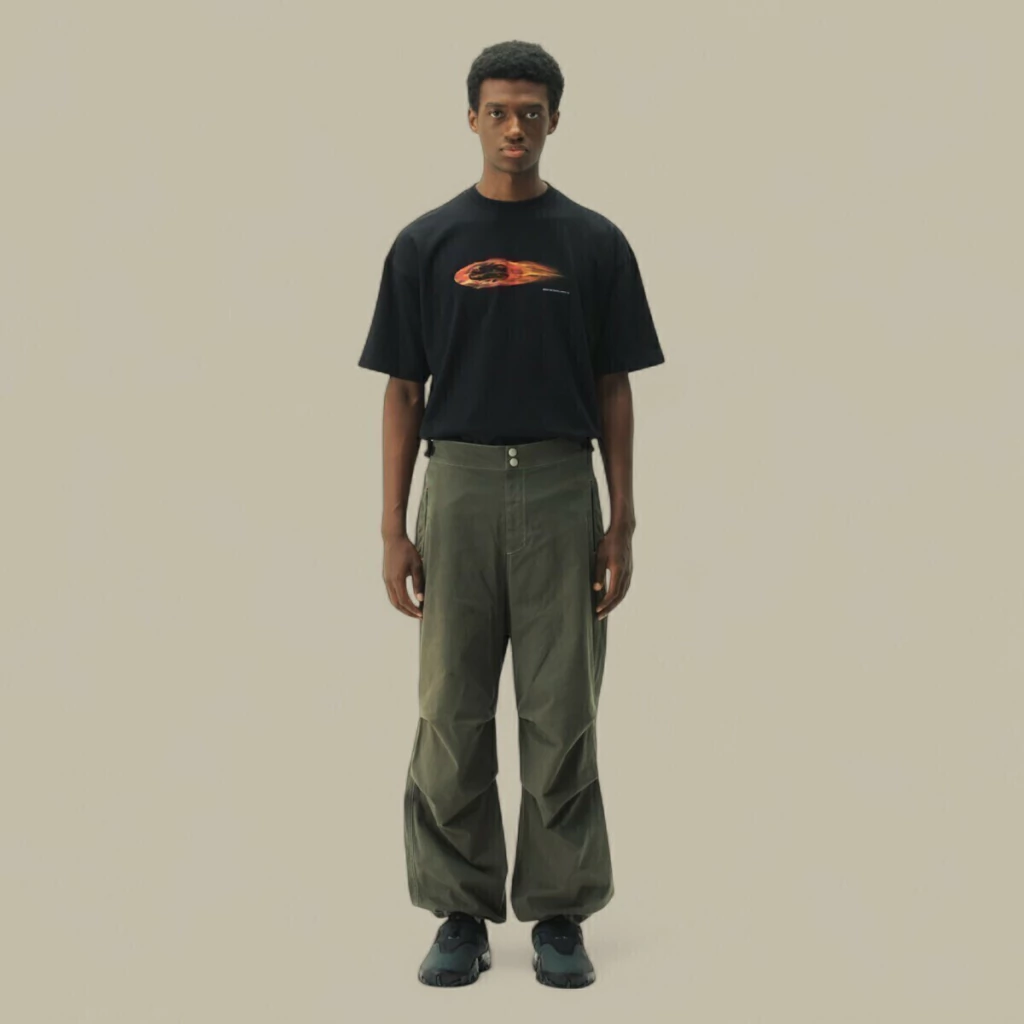 O volume nas pernas termina numa barra mais ampla, que cobre parcialmente o calçado e contribui para um visual mais fluido e urbano. A combinação com os ténis robustos pretos, que aparecem na imagem, mostra como esta calça se insere bem em produções casuais, mas arrojadas, sendo uma escolha acertada para quem gosta de conjugar conforto, liberdade de movimento e uma estética moderna com raízes no workwear e no outdoor.