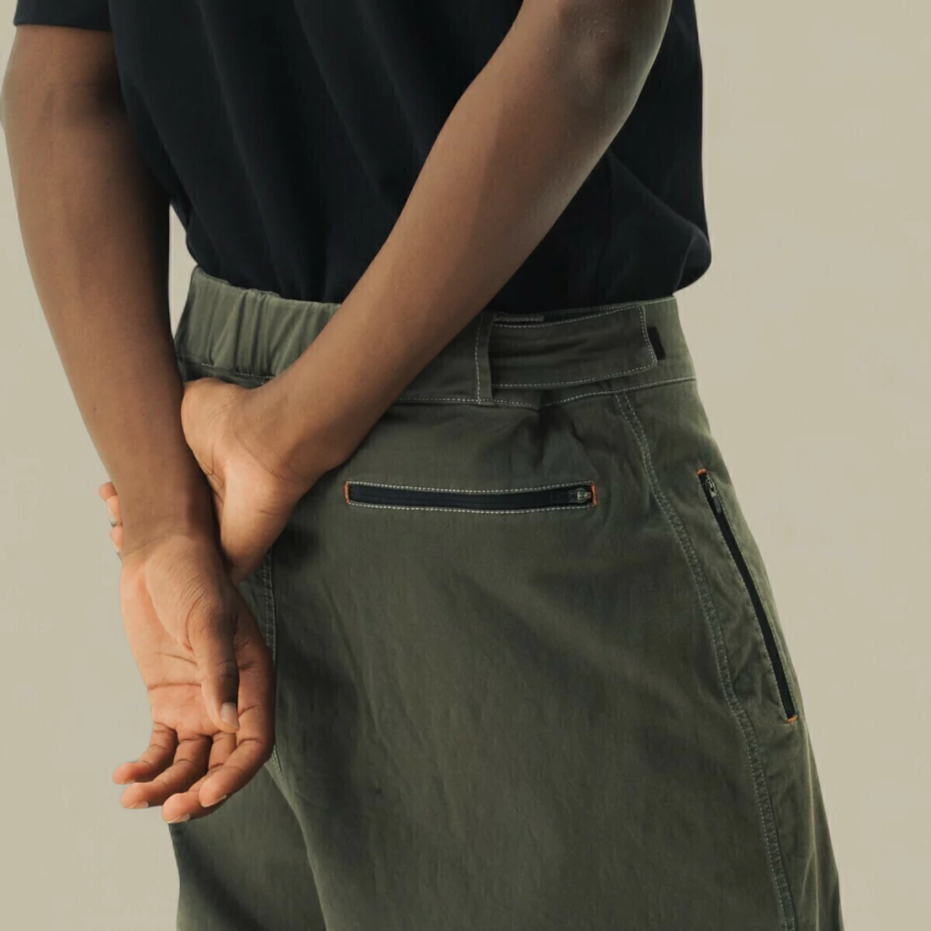 O cós estruturado vem com fecho de dois botões metálicos na frente, que adicionam um toque utilitário e reforçam a sensação de solidez. Os bolsos frontais com fecho em zíper vertical destacam-se como elementos práticos e modernos, ideais para o transporte seguro de objetos pessoais no dia a dia. Esses detalhes utilitários, juntamente com as costuras reforçadas ao longo da calça, indicam uma preocupação com a durabilidade e a funcionalidade da peça, sem comprometer o estilo.