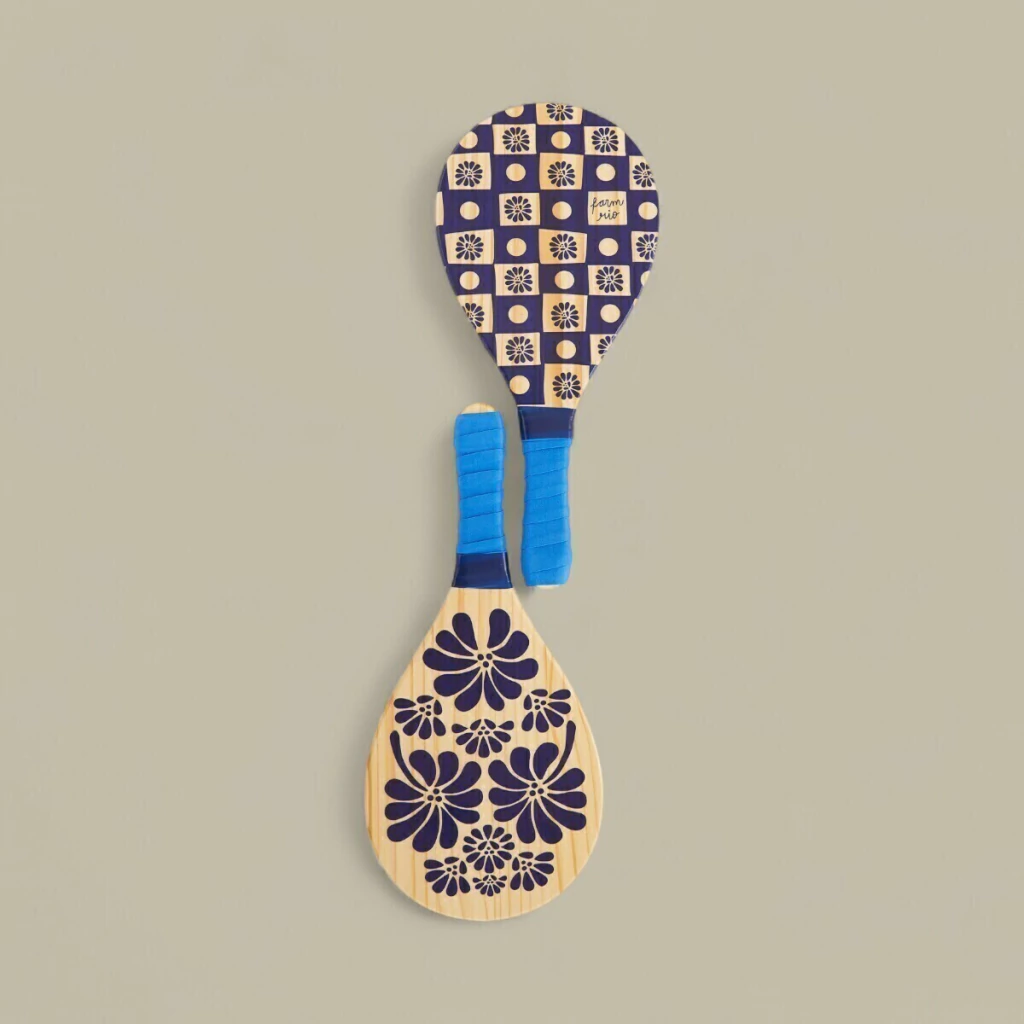 - Design Exclusivo FARM Palermo Azul: Conjunto de raquetes com estampas distintas. Uma raquete apresenta listras verticais em azul e bege claro com uma arara azul estilizada. A outra exibe um padrão quadriculado com detalhes de flores e círculos em azul e bege claro.