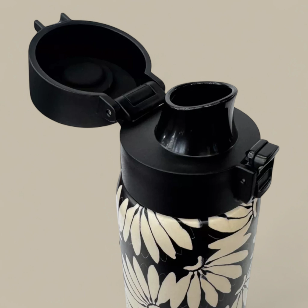 Confeccionada em um material resistente e durável, metal leve com revestimento, esta garrafa exibe um design cilíndrico e elegante, adornado por uma estampa marcante e inconfundível da Farm. O padrão se destaca em branco sobre um fundo preto, apresentando grandes flores estilizadas que remetem a margaridas ou elementos tropicais, conferindo um toque de leveza e sofisticação.