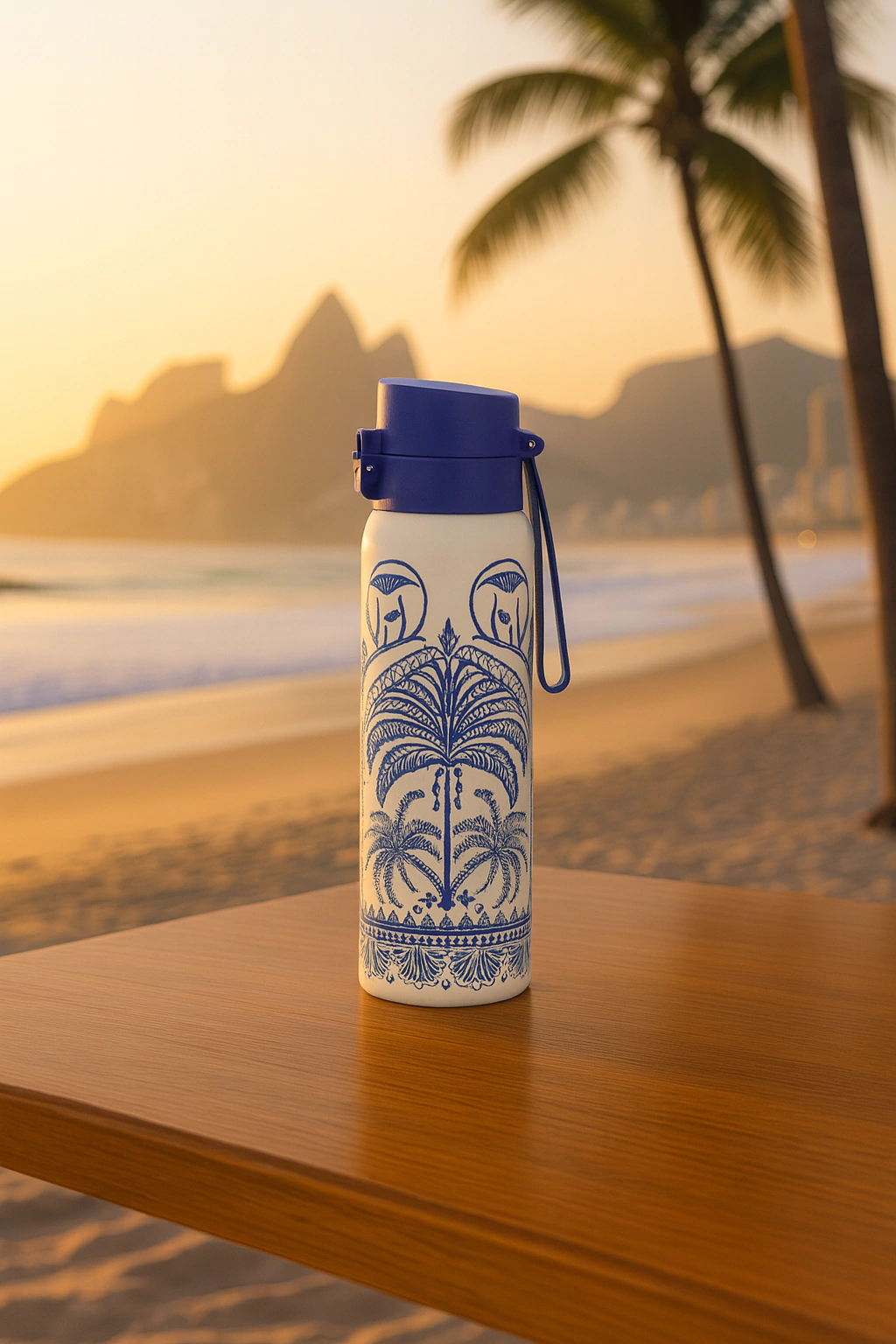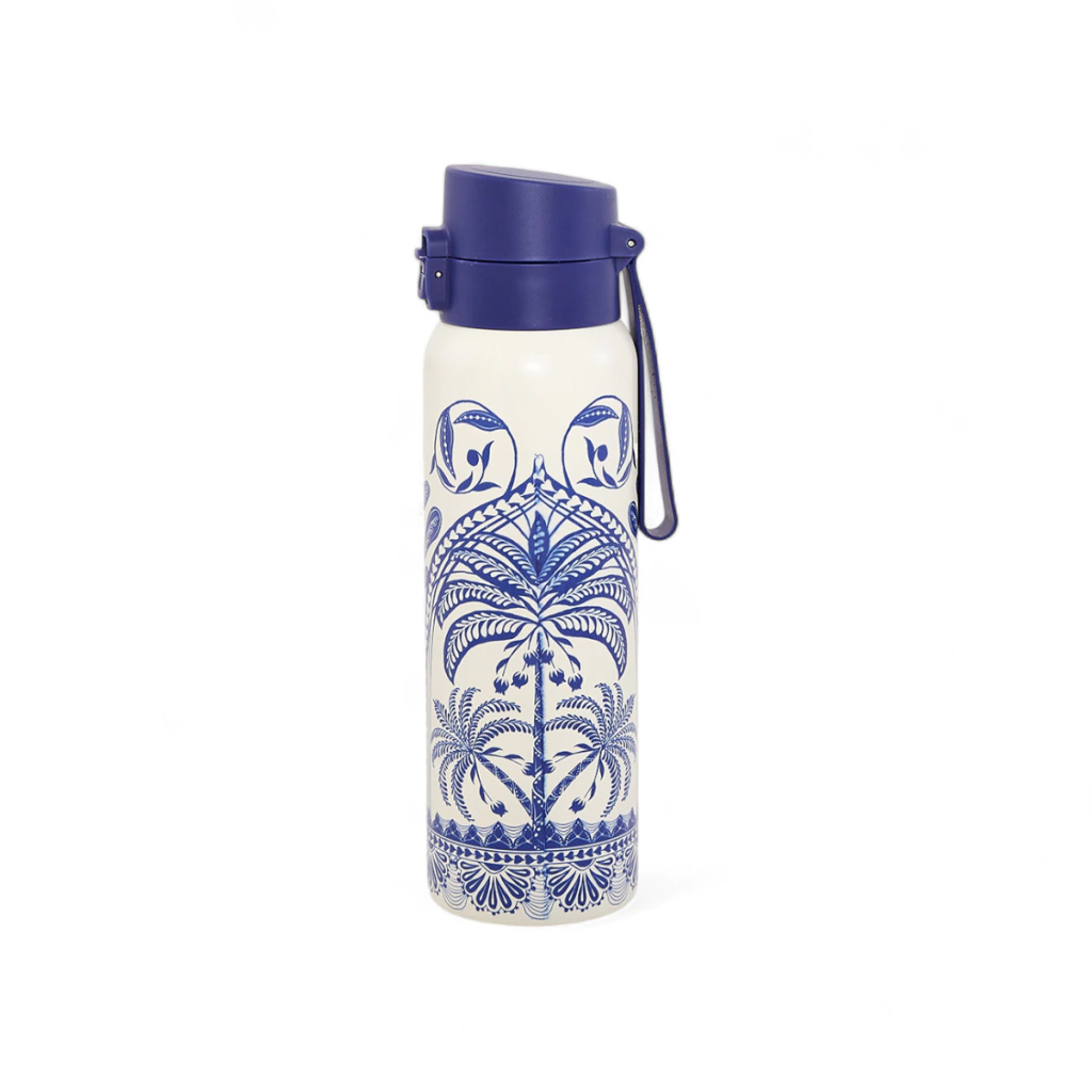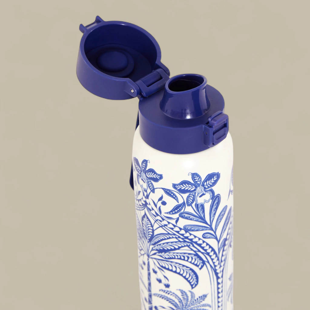 Cor: Branco com estampa azul tropical, tampa azul