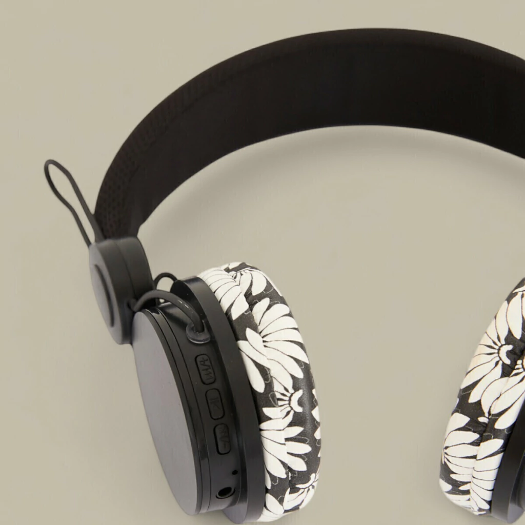 - Design Exclusivo Farm Copabanana: Apresenta conchas auriculares adornadas com a icônica estampa floral em preto e branco, com grandes flores estilizadas que remetem a margaridas, conferindo um toque de charme e personalidade ao seu visual.
