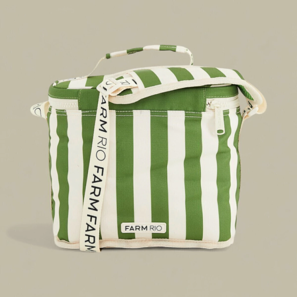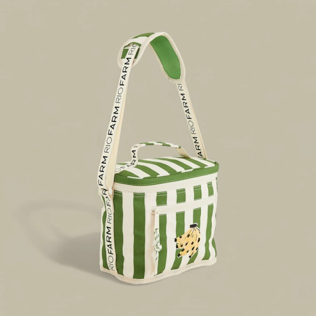 A Mini Cooler FARM Farofa Banana Tropical é perfeita para acompanhar os dias quentes com estilo e praticidade. Com estampa listrada em verde e branco e detalhe divertido de bananas bordadas, ela traz o toque tropical característico da FARM.