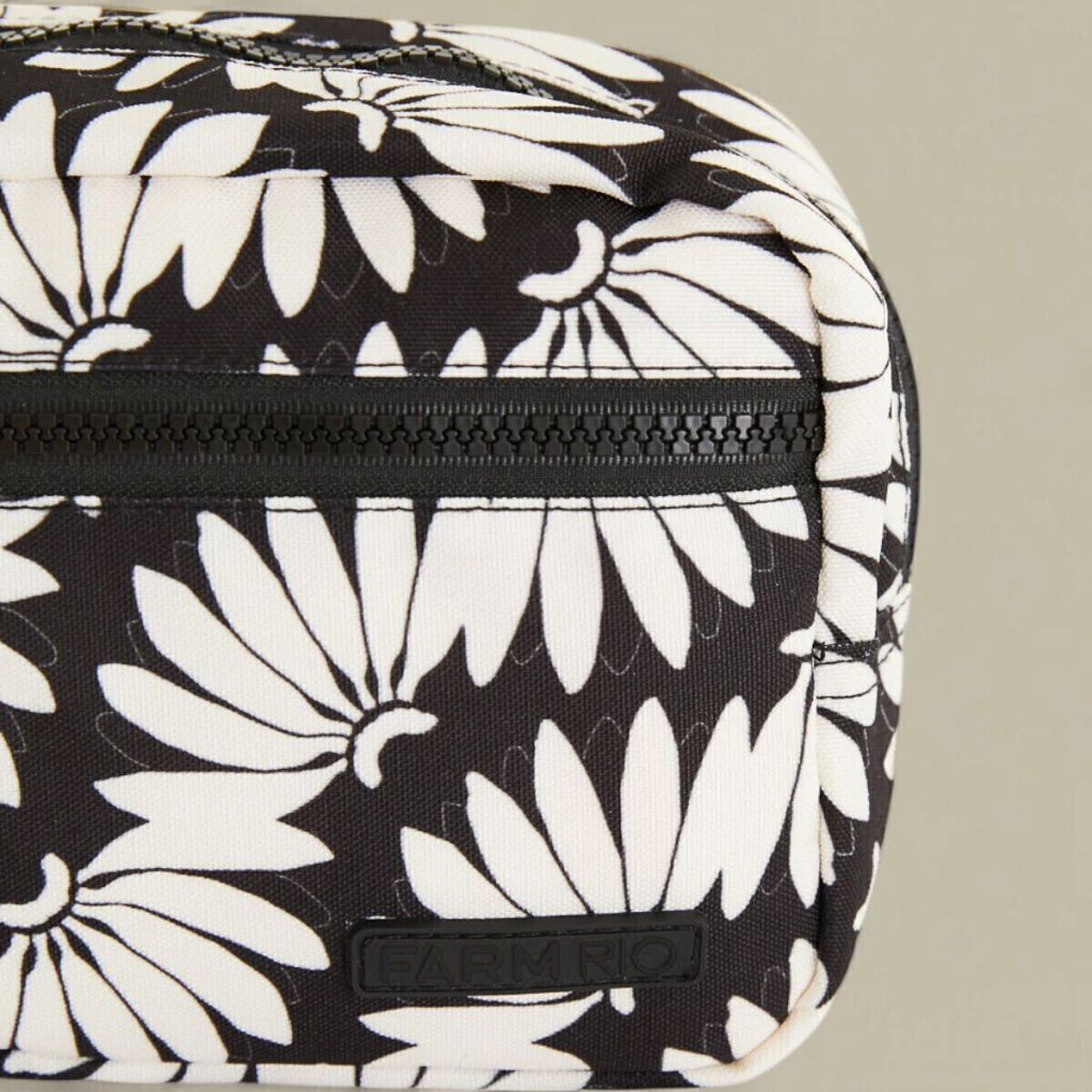 Confeccionada em um tecido durável e leve, provavelmente poliéster ou um material de lona similar, esta peça exibe uma estampa floral cativante em preto e branco, destacando grandes flores estilizadas que lembram margaridas. A paleta monocromática oferece uma estética sofisticada e, ao mesmo tempo, divertida, que é característica da marca Farm.