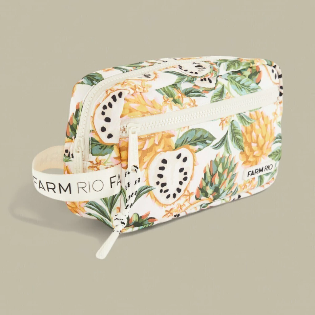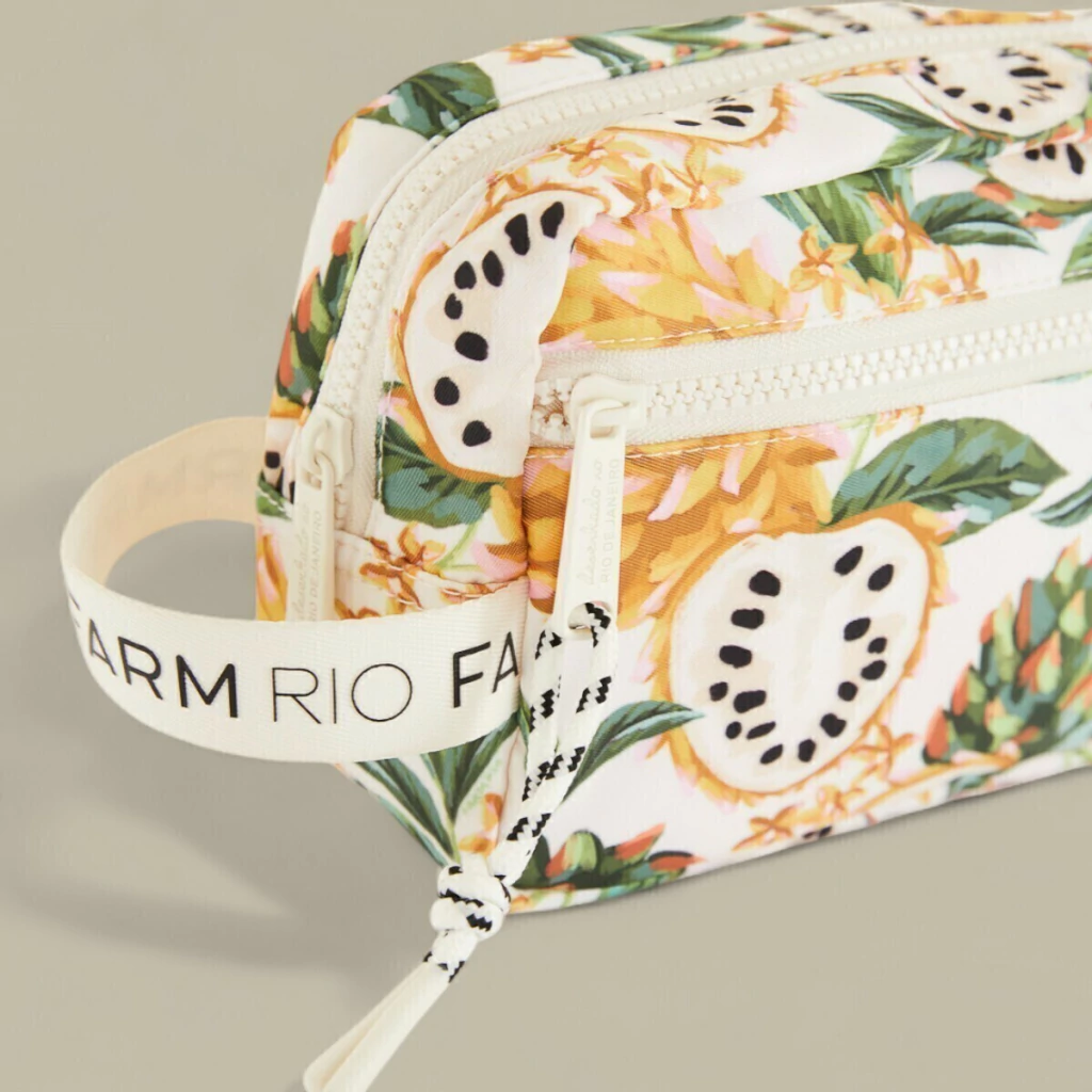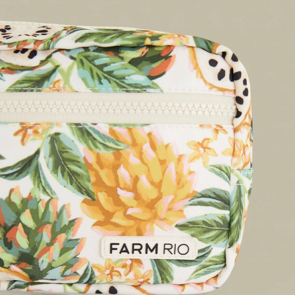 - Alça lateral com logo FARM RIO: Para maior praticidade no transporte e manuseio rápido, facilitando o encaixe em malas ou a organização em gavetas. A logomarca "FARM RIO" em destaque na alça reforça a autenticidade da peça.