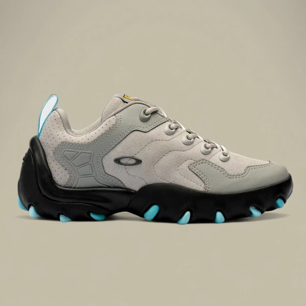 A sola preta tem um design muito característico, com saliências curvas e detalhes em azul-turquesa que não só oferecem tração, como também destacam o estilo futurista do modelo. O logótipo da Oakley surge de forma discreta na lateral, enquanto a etiqueta amarela na língua dá um toque técnico e quase industrial. Na parte de trás, uma alça azul facilita o calçar.