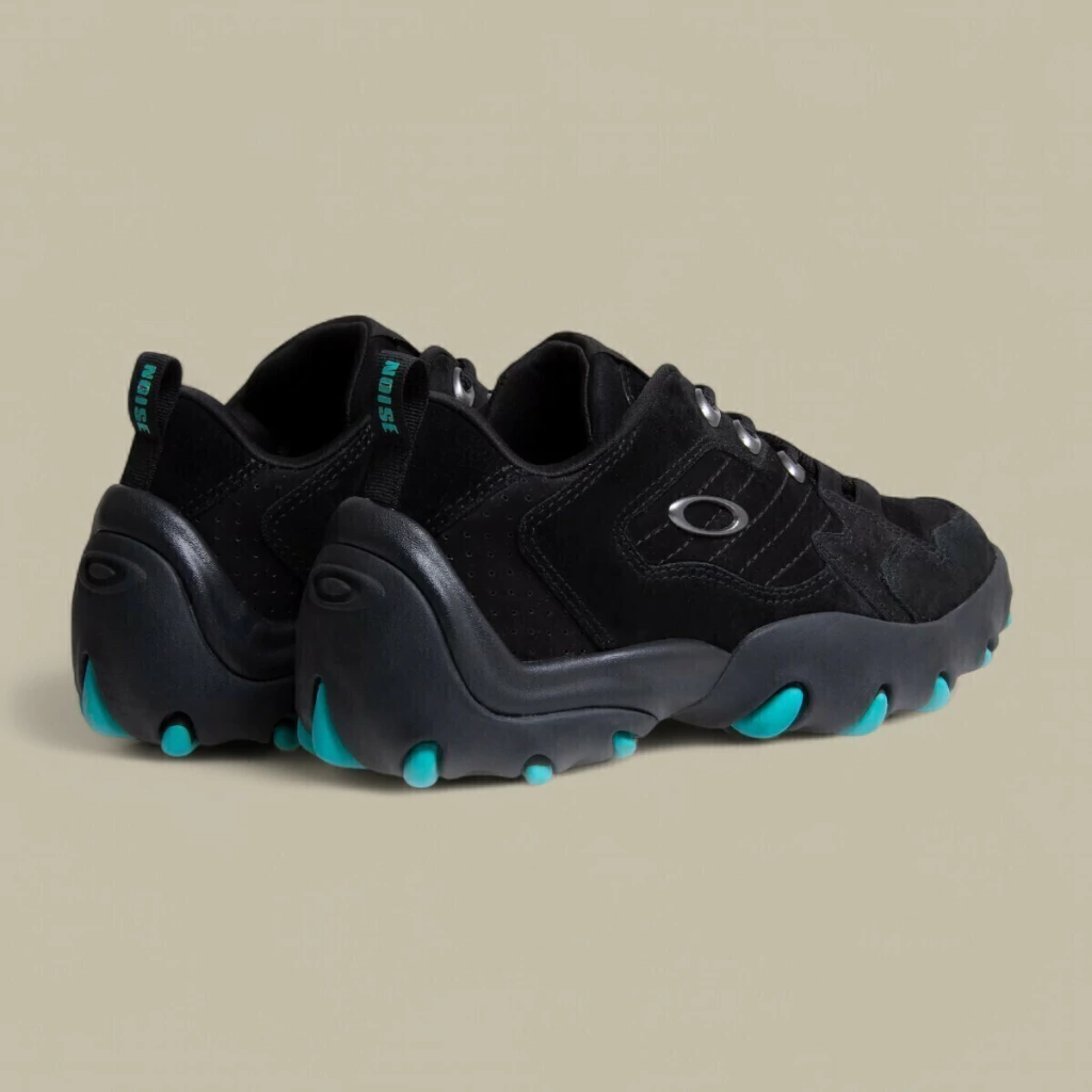 Os ilhós metálicos contribuem para um aspeto mais industrial e moderno, enquanto os atacadores pretos mantêm a estética uniforme e sóbria. Um detalhe que chama a atenção é o pequeno logótipo oval da Oakley na lateral, discreto mas reconhecível, sinal de um produto que alia performance à identidade visual forte da marca.