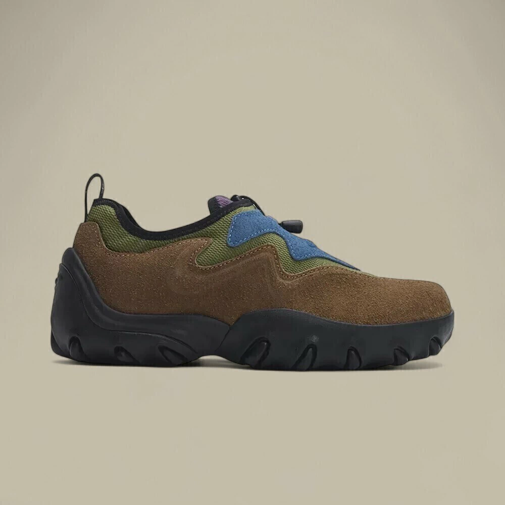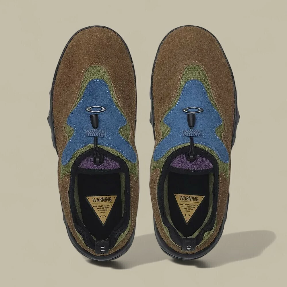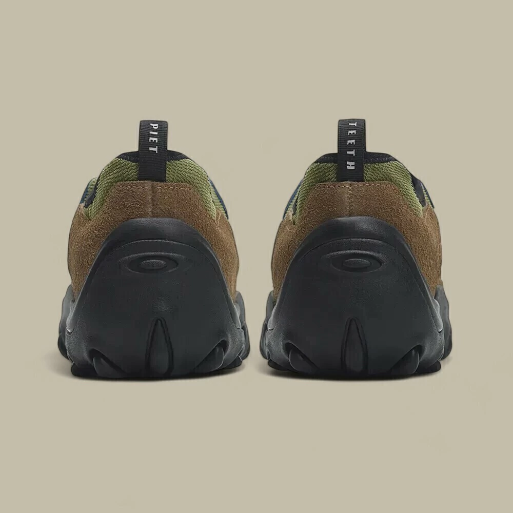 Este ténis resulta de uma colaboração ousada entre a Oakley Factory Team e a marca holandesa Piet, conhecida pelo seu estilo artístico e urbano. O modelo, que parece inspirado no icónico Oakley Flesh dos anos 2000, traz uma abordagem renovada com uma estética quase futurista e orgânica. A parte superior mistura camurça castanha com detalhes em tecido nas cores azul, verde azeitona e um subtil toque de roxo, criando um visual marcante e ao mesmo tempo equilibrado.