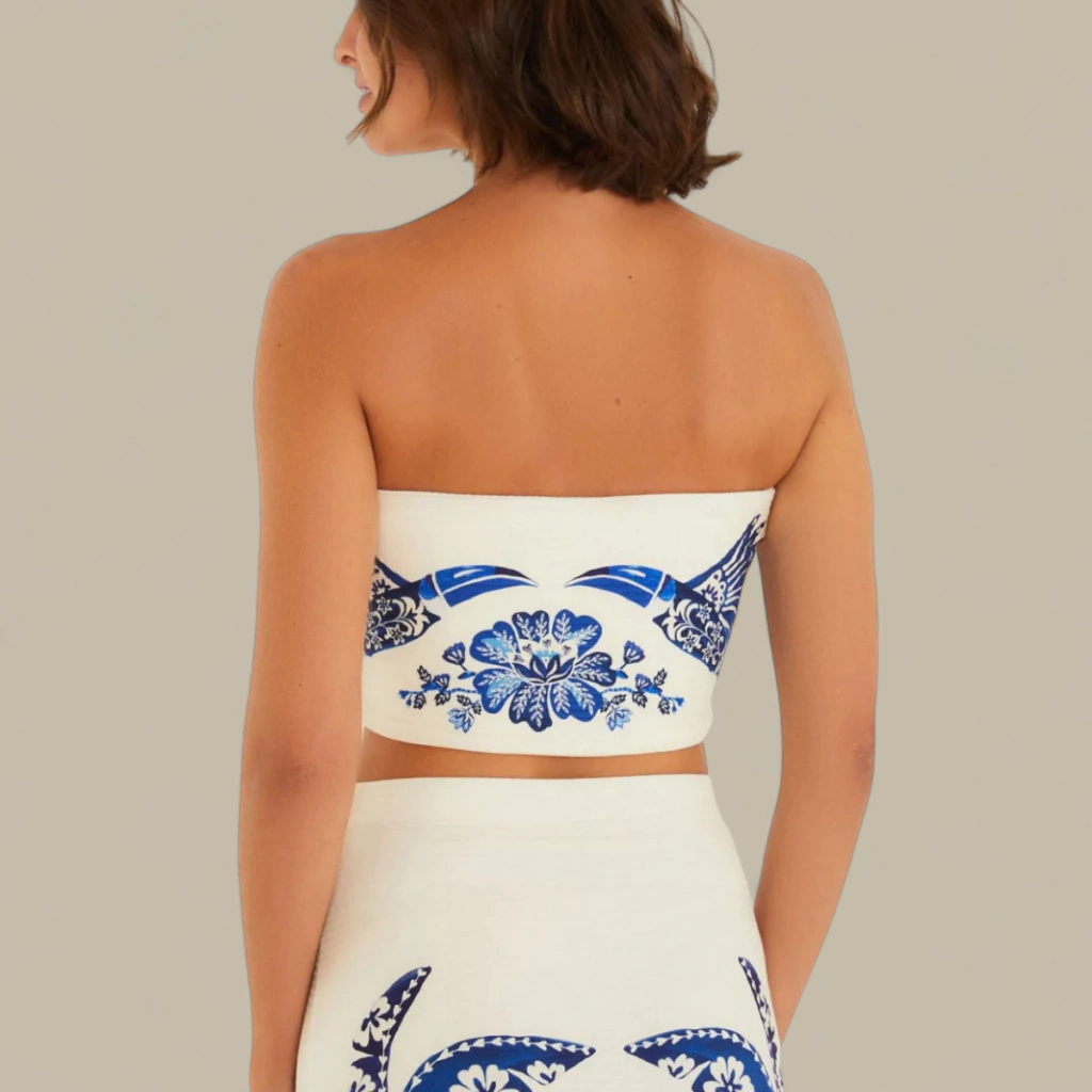 Sua estampa exclusiva em azul vibrante sobre fundo neutro traduz o DNA criativo da marca, trazendo frescor e originalidade. Ideal para usar com saias, shorts ou calças de cintura alta, é um item indispensável para quem gosta de looks casuais, tropicais ou até produções noturnas mais ousadas.